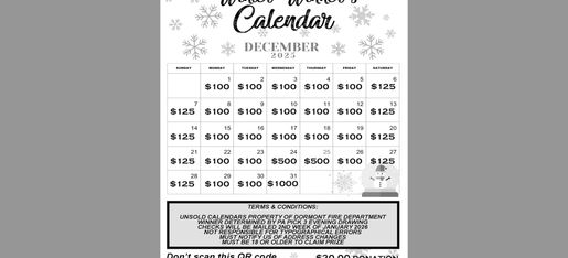 Don't miss out on the Fire Department Lottery Calendar—your daily chance to win cash throughout the month of December while directly supporting your local heroes! For just $21.00, you can grab your calendar in person and start playing. Prefer to buy from home? Get yours delivered for only $22.00, which includes all shipping, handling, and online transaction fees. Every calendar purchase helps fund essential equipment, training, and community safety programs for your fire department. Buy a calendar today and feel great knowing you’re supporting the pe
